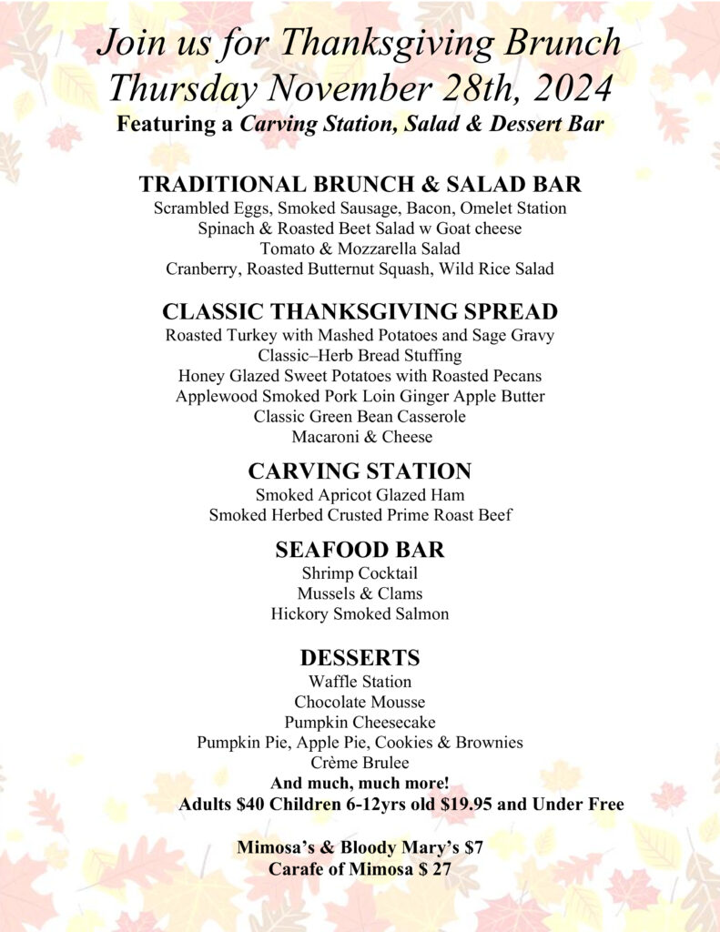 Indulge in a delectable spread of Thanksgiving classics and seasonal specialties, all prepared with care to make your celebration truly memorable. Our adult brunch is priced at $40 per person, while children under 12 can enjoy the feast for just $19.95.